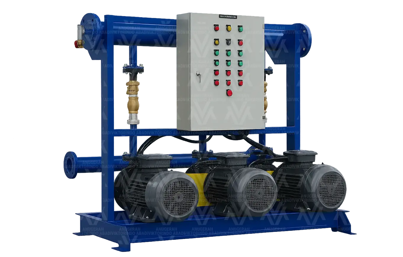 Transfer Pump Set AVACORP adalah sistem pompa yang dirancang untuk memindahkan fluida dari satu titik ke titik lain secara stabil, aman, dan berkesinambungan. Sistem ini digunakan untuk mendukung proses distribusi air maupun cairan industri, baik dari sumber ke tangki penampung, antar tangki, maupun dari tangki ke area proses.